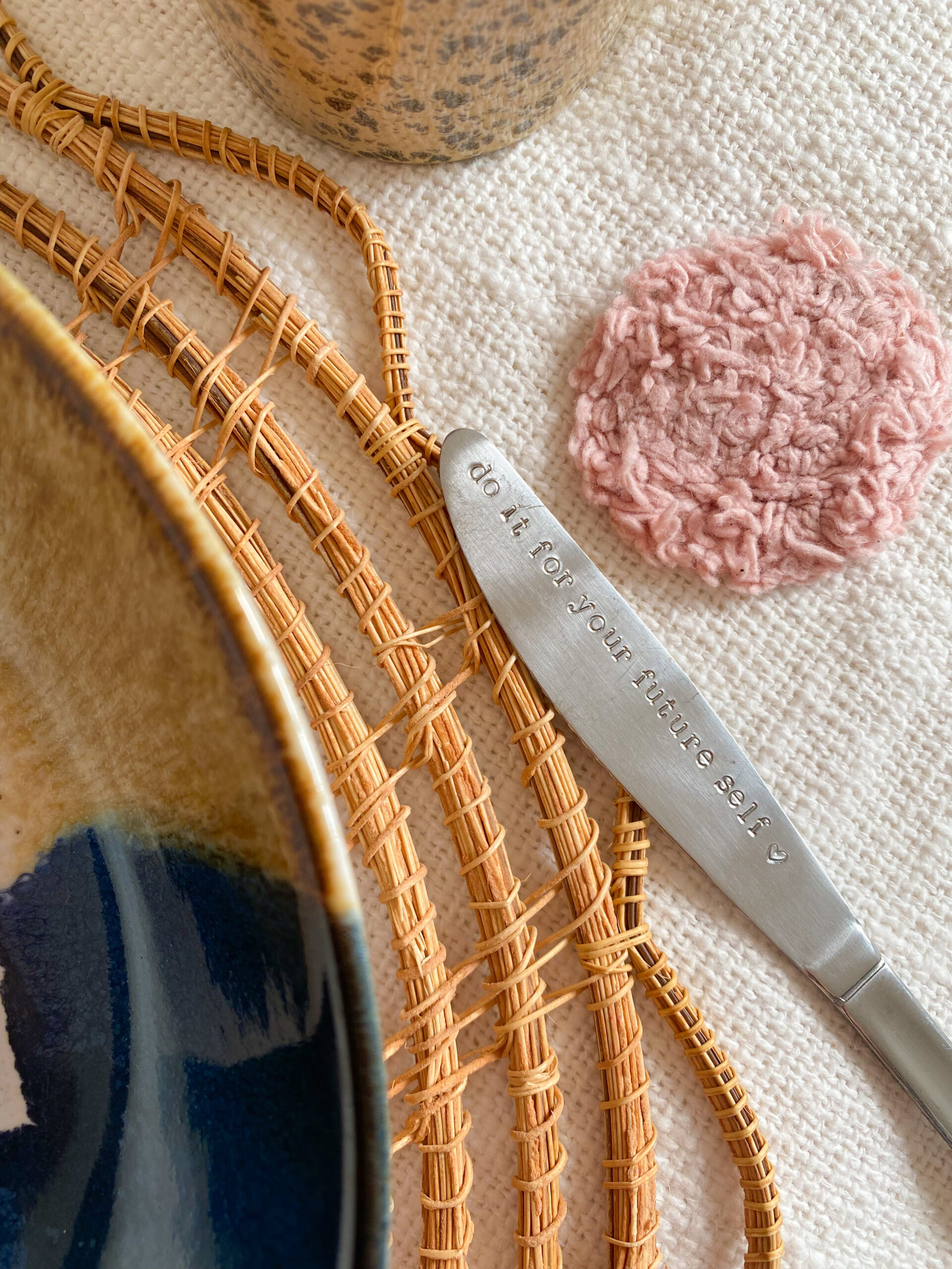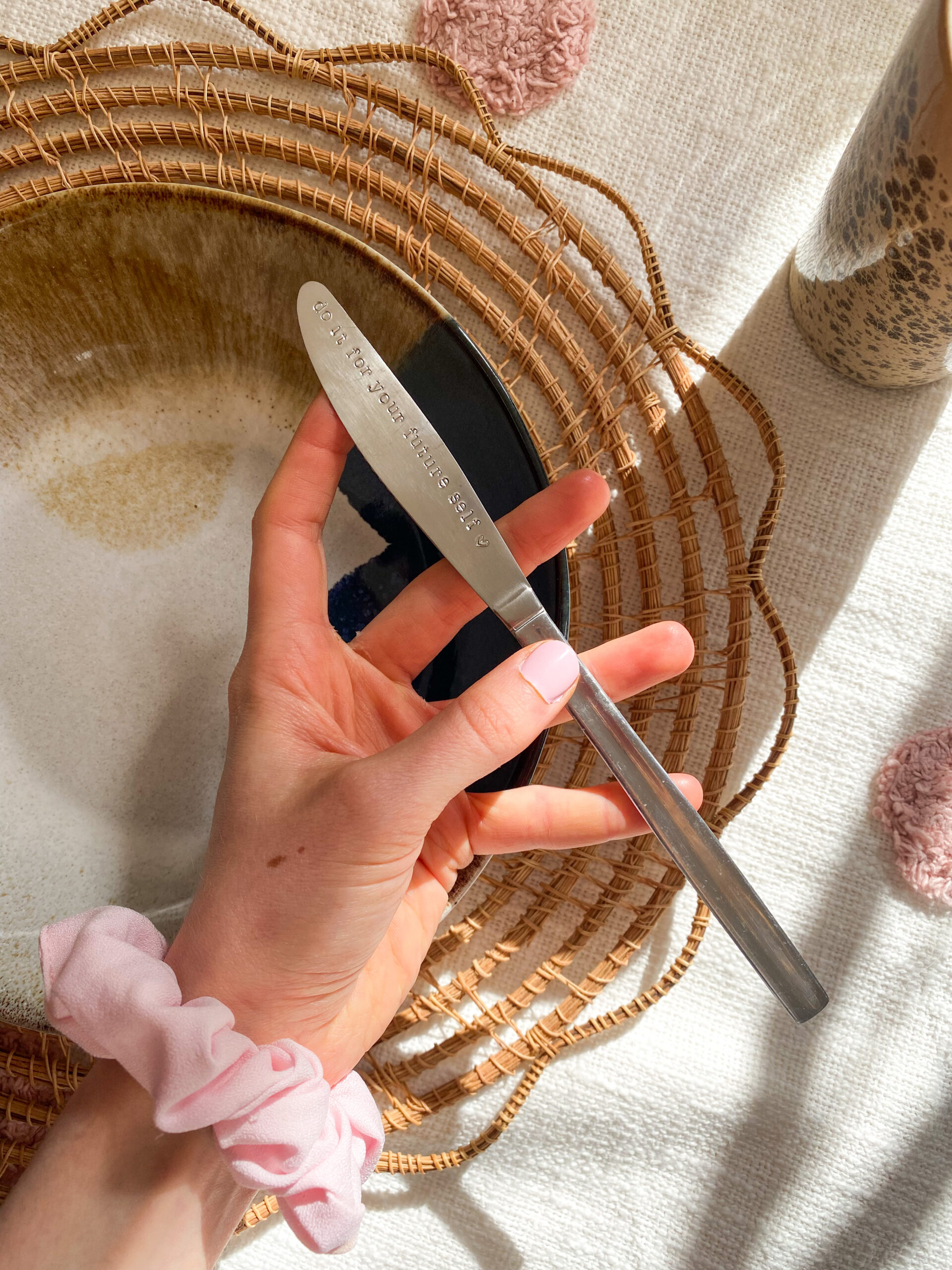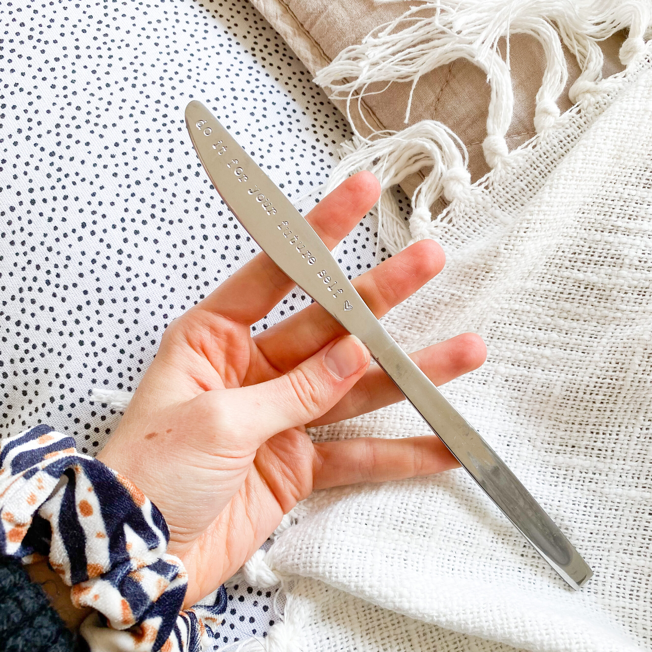 Motiverende, inspirerende en leuke mes met de hand gestempelde tekst: 𝚍𝚘 𝚒𝚝 𝚏𝚘𝚛 𝚢𝚘𝚞𝚛 𝚏𝚞𝚝𝚞𝚛𝚎 𝚜𝚎𝚕𝚏 ♡