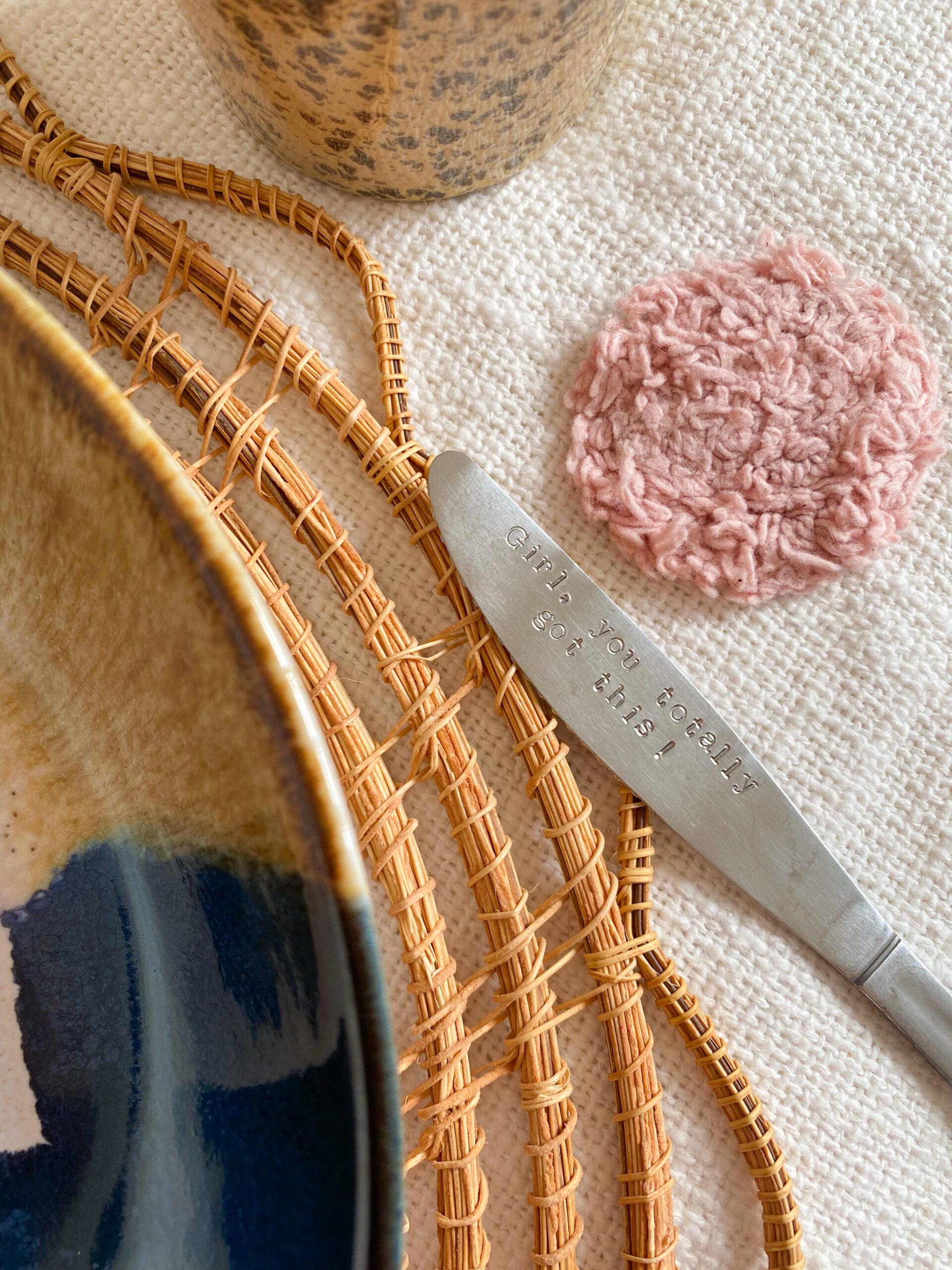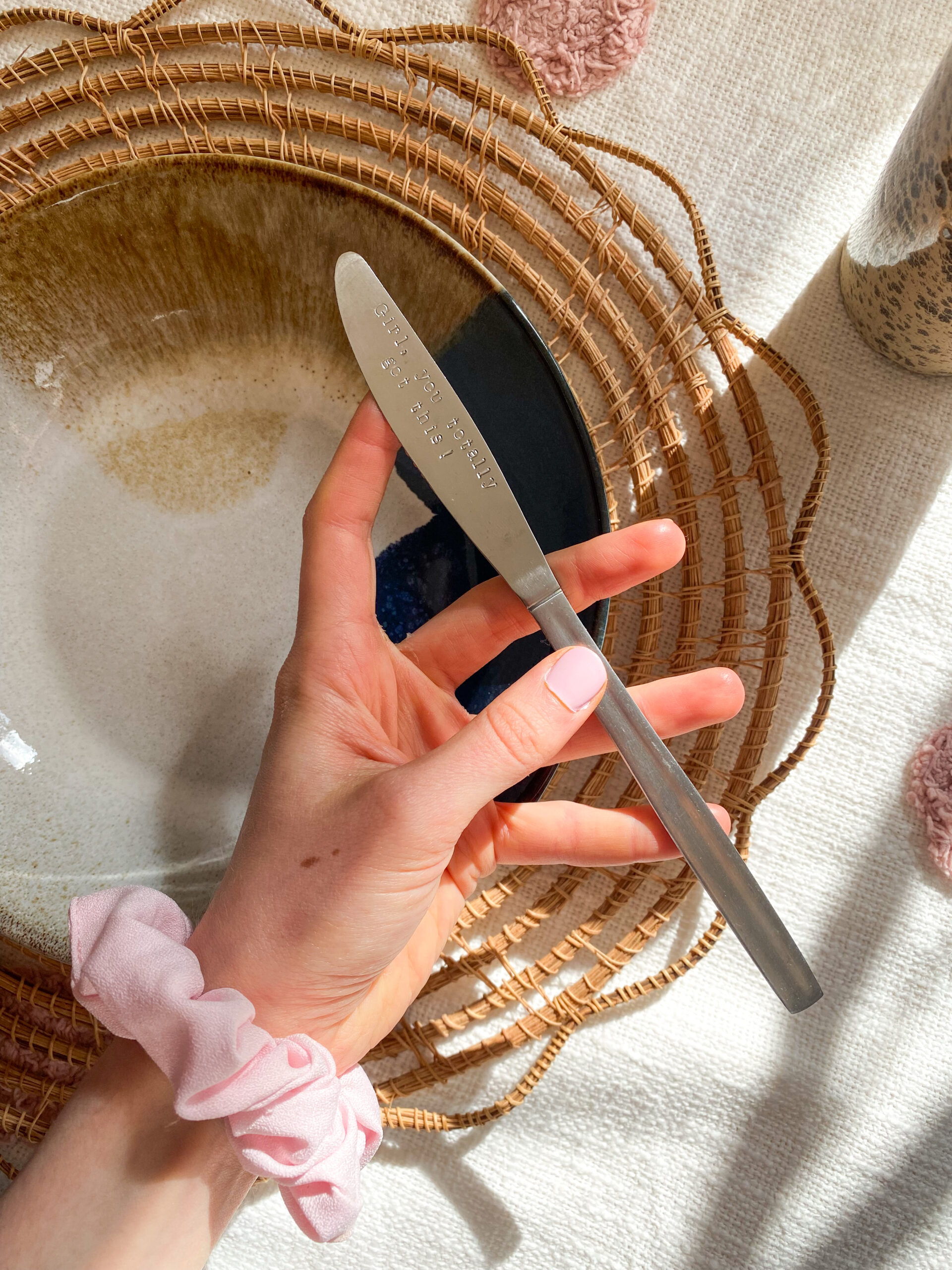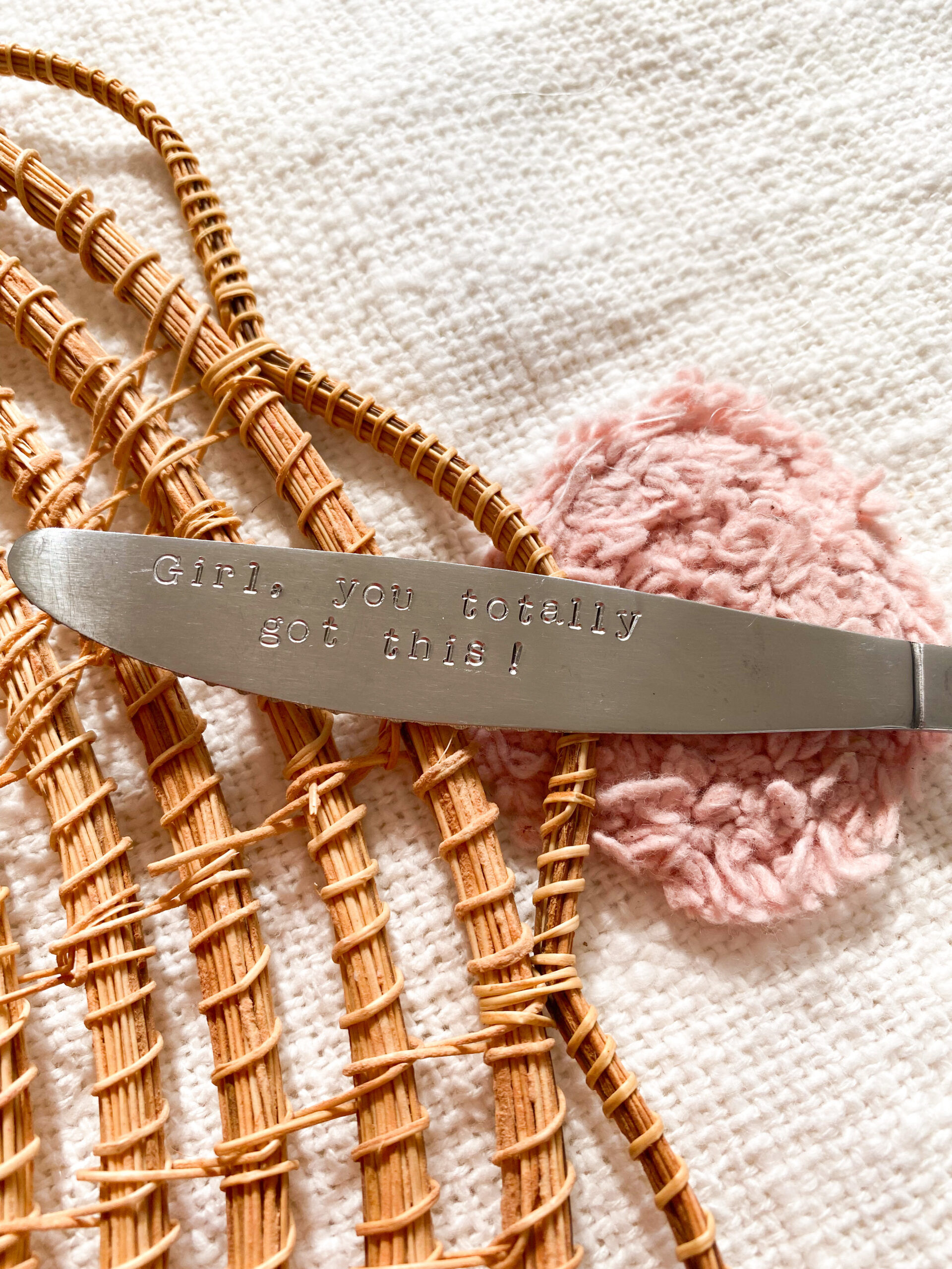 Motiverende, inspirerende en leuke mes met de hand gestempelde tekst: Girl, you totally got this!